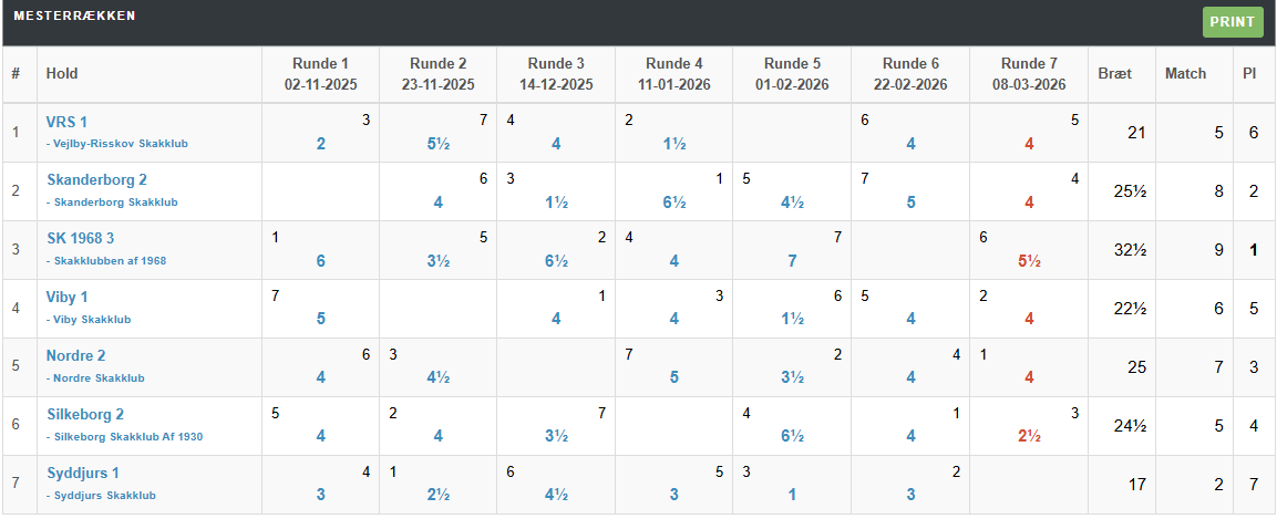 6. runde i årets Mesterrækketurnering var en udekamp mod Syddjurs 1. Desværre med et par kedelige afbud i toppen af holdet, men så er det jo godt, at vi kunne låne lidt oppefra (Klaus Berg) og nedefra (Aske). Vores modstandere fra Syddjurs havde også et par afbud, så det gik vel lige op.