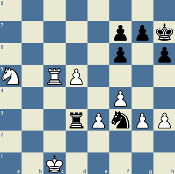 Tårnet er fanget, og må byttes for springeren på c6. Herfra spillede modstanderen stort set fejlfrit, og Torkild måtte til sidst kapitulere. 2-1.