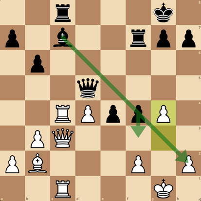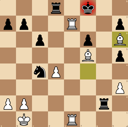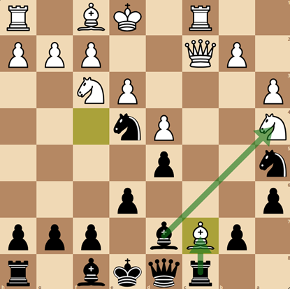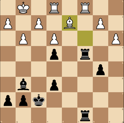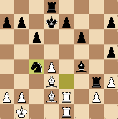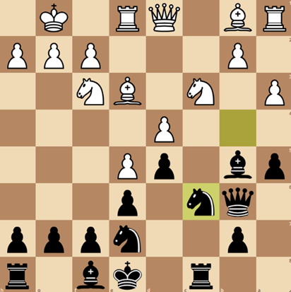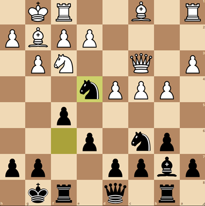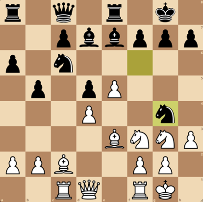Torkild (hvid) spiller siciliansk forsvar og hans modstanders modsvar er 2. c3 Alapin. Torkild kommer lidt i problemer ved træk 14. hvor hans dronning og løber er meget udsat på dronningefløjen, hvis hans modstander finder 15. Db3. Torkild slap med skrækken, da hans modstander i stedet tog løberen på b5 med springeren.