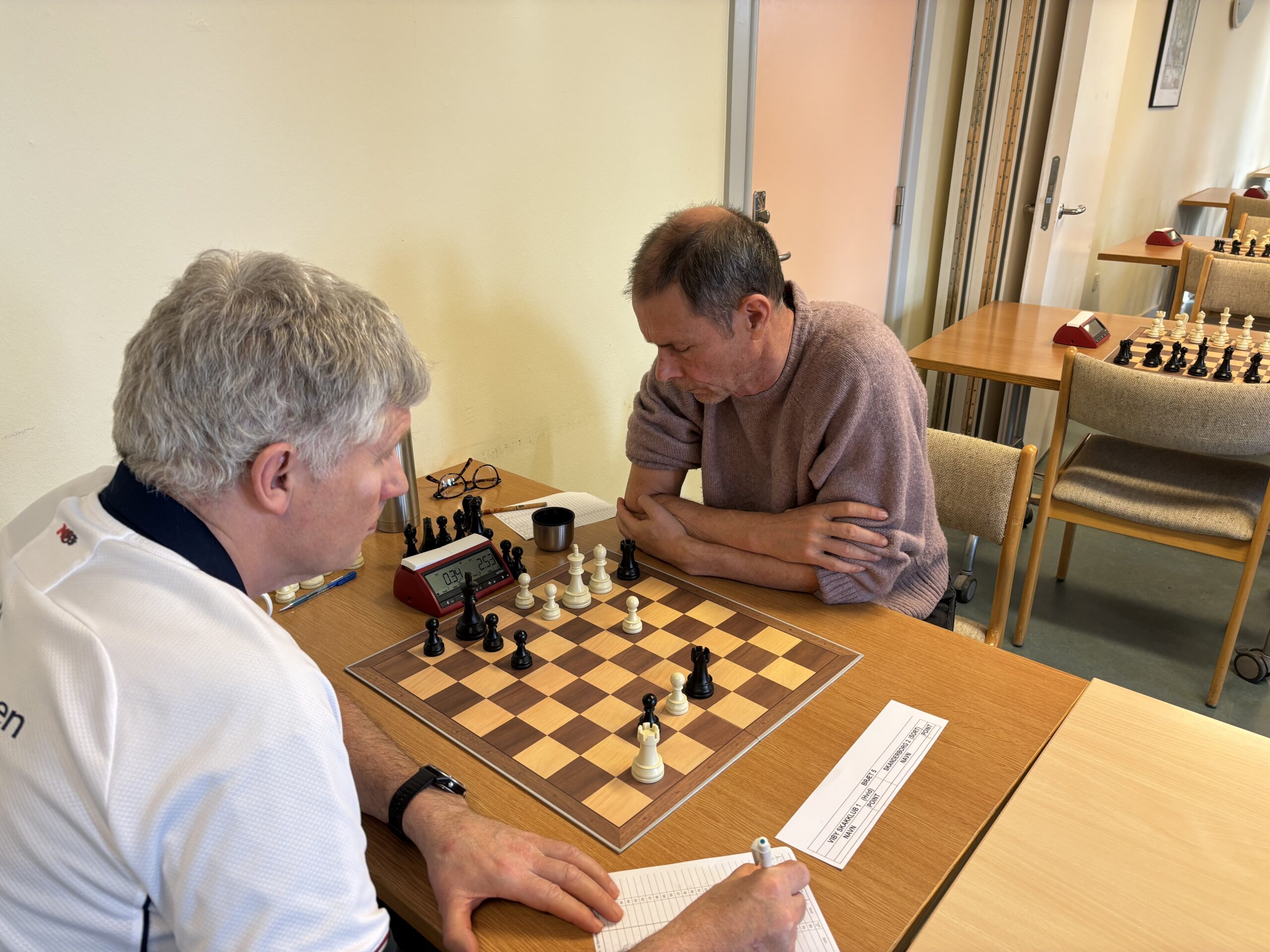 Hold kaptajn var først færdig. Mortens fast London system så godt ud, men Johnny havde modspil og efter en del afbytninger, vil ingen satse, så var den første af mange remiser var i huset.
